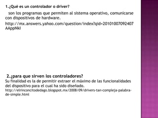 Los controladores o drivers permiten que el sistema operativo se comunique con los dispositivos de hardware como impresoras, cámaras y tarjetas de red. Los controladores descargan desde páginas web y permiten extraer las funcionalidades completas de cada dispositivo. El BIOS es un firmware que controla el arranque del equipo y permite configurar opciones como la pantalla y el disco duro, y la secuencia de arranque determina el orden en que busca sistemas operativos en las diferentes unidades.