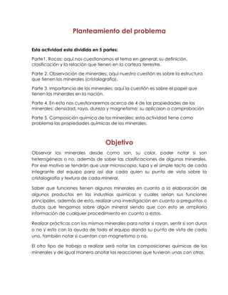 Este documento presenta una guía de trabajo para estudiantes sobre la observación de minerales. El objetivo es observar los minerales para identificar su color, estructura, clasificación y propiedades como la densidad, raya, dureza y magnetismo. El trabajo está dividido en cinco partes: 1) rocas, 2) observación de minerales, 3) importancia de los minerales, 4) propiedades de los minerales, y 5) composición química. Los estudiantes observarán los minerales con lupas y microscopios