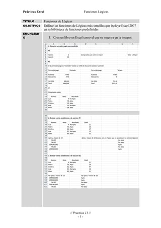 Las funciones lógicas más sencillas de Excel 2007 incluyen IF, AND, OR y NOT. El documento muestra cómo crear un libro de Excel con celdas que contienen estas funciones lógicas para devolver valores verdaderos o falsos dependiendo de las condiciones lógicas especificadas.