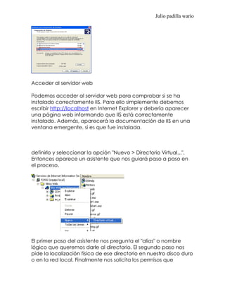 El documento describe los pasos para instalar IIS en Windows XP Professional, incluyendo acceder al CD de instalación o Panel de control para agregar componentes opcionales de Windows, seleccionar el servicio IIS e instalar componentes adicionales como FTP. También explica cómo acceder al servidor web local mediante la dirección http://localhost y crear un directorio virtual siguiendo los pasos de un asistente para definir el alias, ubicación y permisos.