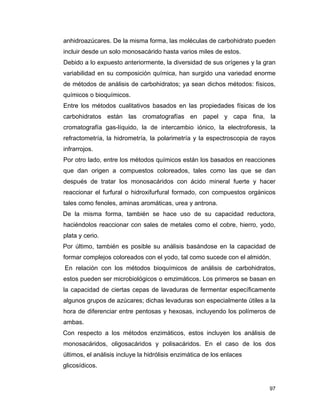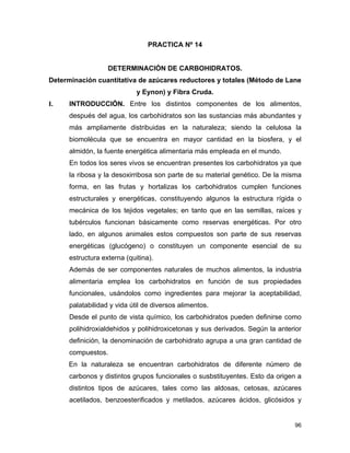 Este documento describe métodos para determinar carbohidratos en alimentos. Explica que los carbohidratos son importantes componentes de los alimentos y que existen muchos tipos diferentes. Luego detalla dos métodos específicos: 1) El método de Lane y Eynon para determinar azúcares reductores y totales mediante titulación con solución de Fehling. 2) El método para determinar fibra cruda como residuo después de digestión ácida y alcalina e incineración. El documento provee detalles sobre reactivos, procedimientos y