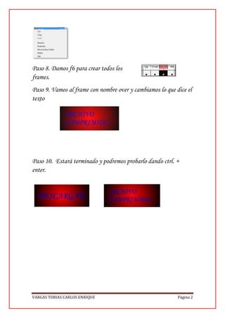 El documento proporciona 10 pasos para crear un botón interactivo en Macromedia Flash Professional 8, incluyendo dibujar una forma rectangular, agregar texto, cambiar la fuente y color del texto, convertir la figura en un símbolo de botón, editar los cuadros para cambiar el texto cuando el usuario pasa el mouse sobre el botón, y probar el botón pulsando Ctrl + Enter.