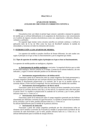 Este documento presenta una práctica de laboratorio sobre el análisis de circuitos eléctricos en corriente continua. Introduce los conceptos básicos de aparatos de medida como el amperímetro, voltímetro y ohmímetro. Luego, propone tres circuitos sencillos (serie, paralelo y mixto) para que el estudiante realice medidas, aplique las leyes de Ohm y Kirchhoff, y compare los resultados experimentales con los teóricos.