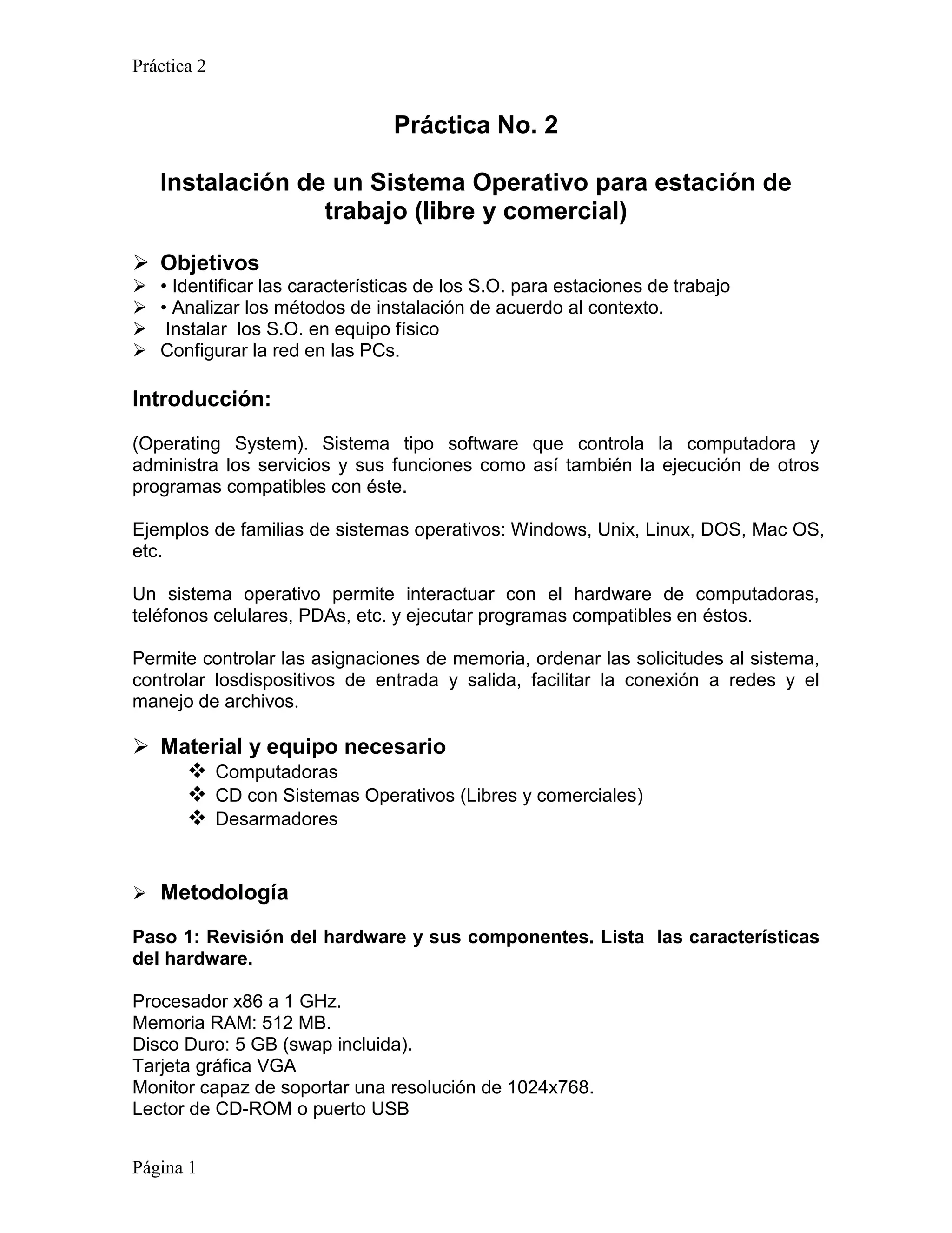 El documento describe los pasos para instalar un sistema operativo libre y comercial en una estación de trabajo. Incluye objetivos, materiales necesarios, y un método de 6 pasos que involucra revisar el hardware, iniciar la instalación, instalar software adicional, verificar dispositivos, configurar la red, y reflexionar sobre la importancia de conocer el hardware y software.