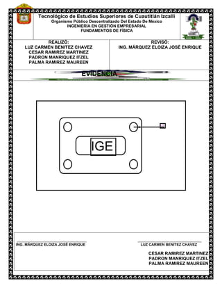 Este documento presenta los fundamentos de física para el programa de Ingeniería en Gestión Empresarial en el Tecnológico de Estudios Superiores de Cuautitlán Izcalli. Fue realizado por Luz Carmen Benitez Chavez, Cesar Ramirez Martinez, Padron Manriquez Itzel y Palma Ramirez Maureen y revisado por el Ing. Márquez Eliza José Enrique.