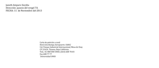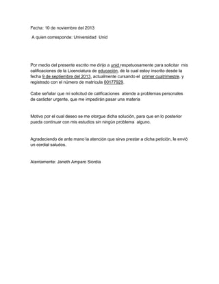 Janeth Amparo Siordia solicita a la Universidad UNID sus calificaciones de la Licenciatura en Educación, en la que ha estado inscrita desde el 9 de septiembre de 2013. Actualmente cursa el primer cuatrimestre con el número de matrícula 00177929. Solicita las calificaciones debido a problemas personales urgentes que le impedirán pasar una materia, por lo que requiere las calificaciones para poder continuar sus estudios sin problemas.