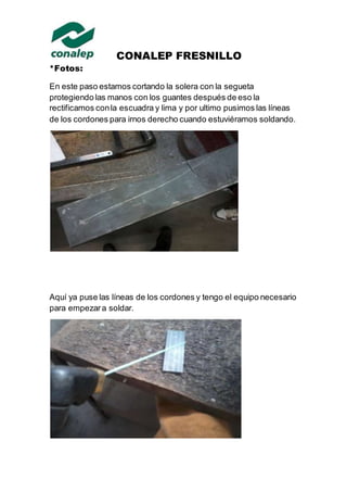 El estudiante Iván Alejandro Santana Cabral completó la práctica #2 de soldadura en posición plana usando el proceso SMAW bajo la supervisión del maestro Jesús Alberto Adame Mercado. El estudiante cortó y preparó una placa de acero, soldó seis cordones de 1/2 pulgada de separación cada uno usando electrodos verdes y naranjas, y aprendió los procedimientos de soldadura y medidas de seguridad requeridas.