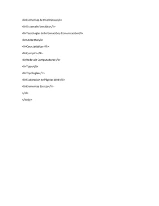 El documento describe el proyecto integrador para los alumnos de sexto semestre de la materia Laboratorio de Informática V. El proyecto cubrirá conceptos básicos de informática, sistemas informáticos, elementos de informática, tecnologías de información y comunicación, redes de computadoras y la elaboración de páginas web.