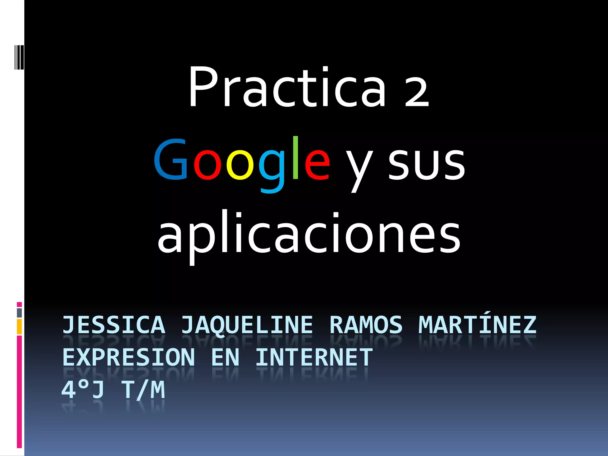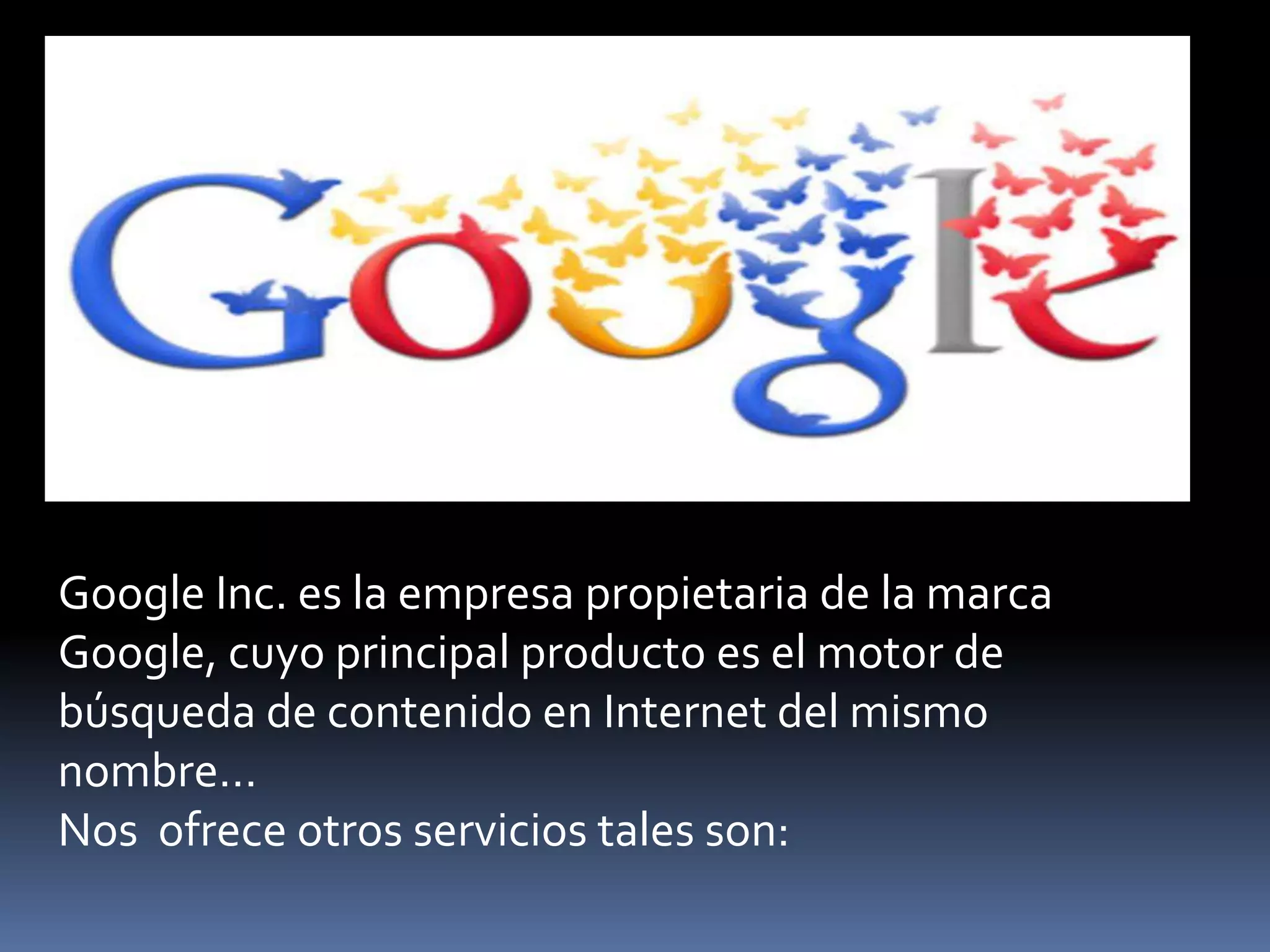 Google es una empresa conocida principalmente por su motor de búsqueda de internet. El documento describe varias aplicaciones populares de Google como Gmail, YouTube, Blogger, Picasa, Google Earth, Google Maps, Google Docs, Google Calendar y Google Traductor, que ofrecen servicios de correo electrónico, alojamiento de videos, blogs, almacenamiento de fotos, mapas interactivos y herramientas de oficina en línea.
