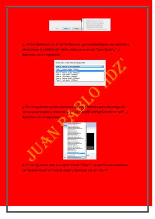 Este documento proporciona instrucciones en 14 pasos para exportar un video. Estos incluyen importar el video, seleccionar la calidad y opciones de reproducción, cambiar el nombre del archivo, y exportar el video en formato SWF para poder reproducirlo en un explorador web.