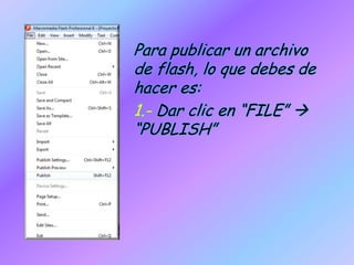 Para publicar un archivo de flash, solo debes dar clic en "FILE" y luego "PUBLISH", y esperar a que se cargue para que el archivo quede guardado en formatos SWF y HTML.