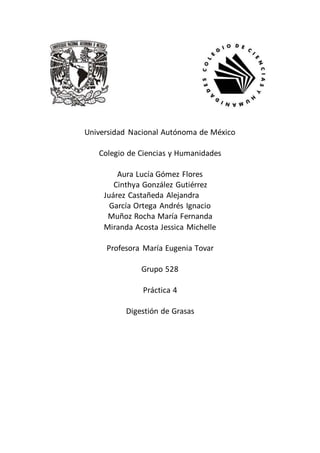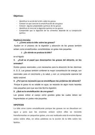 Este documento presenta los objetivos, hipótesis iniciales, materiales y equipo, resultados y discusión de un experimento sobre la digestión de grasas. El experimento buscó identificar cómo actúa la bilis sobre las grasas al emulsionarlas y dividirlas en gotas más pequeñas para su digestión. Los resultados mostraron que la bilis y el jabón pudieron emulsionar las grasas de manera efectiva, dividiéndolas en gotas pequeñas y separadas.
