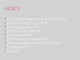 Este módulo permite editar documentos en un servidor web mediante WebDAV. Proporciona funcionalidades como crear, cambiar y mover archivos de forma remota. Se usa principalmente para permitir la edición colaborativa de documentos almacenados en un servidor. Requiere configuración de autenticación y cuotas de almacenamiento para prevenir ataques como denegación de servicio.