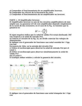 Este documento describe una práctica de laboratorio sobre amplificadores inversores y no inversores. La práctica tiene como objetivos comprobar el funcionamiento y efectos de la frecuencia de corte de un amplificador inversor, y comprobar el funcionamiento de un amplificador no inversor. Se realizan medidas para determinar la ganancia de -10 para el amplificador inversor y de 11 para el no inversor. También se determina experimentalmente la frecuencia de corte de 475 kHz para el circuito del amplificador inversor.