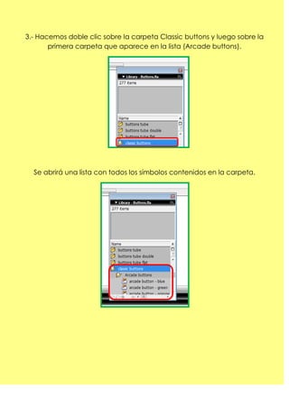 Este documento proporciona instrucciones para modificar una instancia de un símbolo en Adobe Flash. Explica cómo arrastrar un símbolo de la biblioteca de botones a la escena y luego modificar su tamaño usando la herramienta de transformación libre. Aclara que al modificar la instancia, el símbolo original permanece intacto y puede seguir usándose para crear más instancias modificadas.