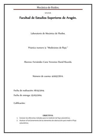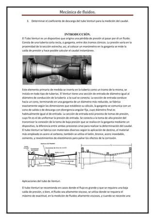 Este documento describe una práctica de laboratorio sobre medición de flujo. Los estudiantes midieron el flujo a través de varios instrumentos como un tubo Venturi, rotámetro y medidor volumétrico. Realizaron cálculos teóricos del flujo y determinaron el coeficiente de descarga para el tubo Venturi en diferentes condiciones. Presentaron sus resultados en tablas y gráficas y respondieron preguntas sobre los principios y aplicaciones de los diferentes métodos de medición de flujo.