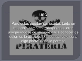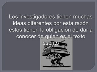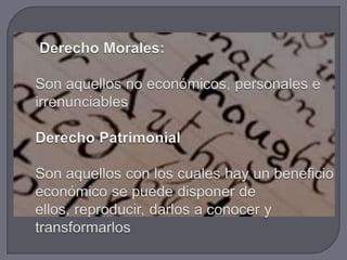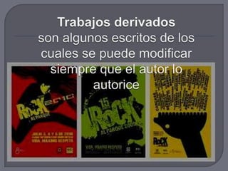 El documento habla sobre los derechos de autor y sus regulaciones. Explica que los derechos de autor protegen los derechos morales y patrimoniales de los creadores sobre sus obras literarias, artísticas y otras creaciones. También establece que se necesita permiso para utilizar el trabajo protegido de otros y darles crédito.