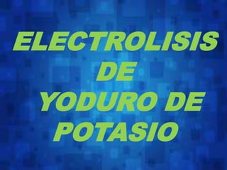 (1) Este documento describe un experimento de electrólisis de una solución de yoduro de potasio. (2) Durante la electrólisis, los iones de potasio se reducen en el cátodo formando hidróxido de potasio y los iones de yodo se oxidan en el ánodo formando yodo elemental. (3) El objetivo es observar cómo la sal inorgánica de yoduro de potasio puede ser descompuesta en sus iones a través de la electrólisis.