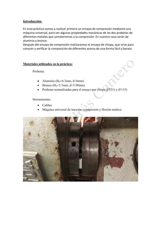 La práctica involucra realizar ensayos de compresión en probetas de aluminio y bronce usando una máquina universal para determinar sus propiedades mecánicas. Luego, se llevará a cabo un ensayo de chispa para identificar la composición de probetas de acero mediante la comparación de la forma de la chispa producida con muestras de referencia.