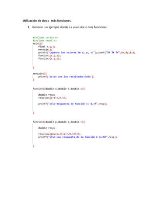 Este documento presenta un proyecto sobre el uso de múltiples funciones en C. Incluye ejemplos de funciones como compuertas lógicas OR y AND que toman bits como entrada y devuelven un bit de salida. También propone como ejercicio crear funciones para compuertas OR y AND con diferentes números de bits de entrada.