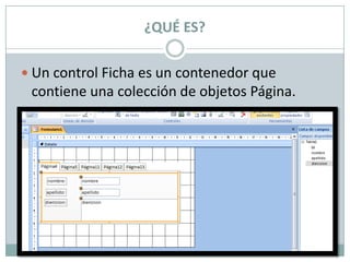 Un control de ficha es un contenedor que organiza la información de una base de datos en varias páginas o fichas. Para crear una ficha en un formulario, se selecciona la opción de formulario en blanco, luego se arrastra el control de ficha sobre la cuadricula del formulario desde las herramientas de diseño. Las páginas de una ficha pueden tener un título, imagen y ser activadas o desactivadas para su visualización.