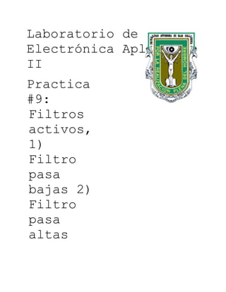 Este documento describe una práctica de laboratorio sobre filtros activos pasa bajas y pasa altas. El objetivo era comprobar y analizar el funcionamiento de ambos filtros. Se calculó y simuló cada circuito, y luego se midieron las señales de entrada y salida para diferentes frecuencias, determinando la frecuencia de corte teórica, simulada y experimental. Los resultados mostraron que los filtros reducen gradualmente la amplitud de la señal de salida al acercarse a la frecuencia de corte, en lugar de cortarla abruptamente.