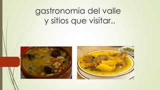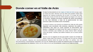 Este documento describe varios aspectos de la gastronomía y atracciones turísticas del Valle de Aran en España. La cocina tradicional del valle se basa en ingredientes locales como setas, frutas silvestres y truchas. Entre los platos típicos se encuentra el pato con frutas del bosque y la olla aranesa. El valle ofrece actividades al aire libre como senderismo y ciclismo, así como lugares para visitar como la iglesia de Viella, el museo del valle y la quesería de