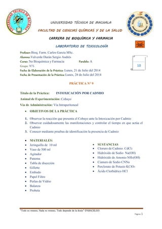 Este documento describe un experimento en el que se intoxicó a un cobayo con cadmio para observar sus síntomas y confirmar la presencia de cadmio a través de pruebas de identificación. Se administró cloruro de cadmio al cobayo por vía intraperitoneal y se observó la pérdida de equilibrio, convulsiones y muerte en 6 minutos. Las pruebas con hidróxido de sodio, hidróxido de amonio y cianuro de sodio confirmaron positivamente la presencia de cadmio. El documento concluye