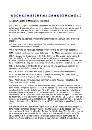 Este documento presenta un glosario de términos informáticos e internet. Contiene definiciones de más de 100 términos comunes como @, A, ADSL, algoritmo, aplicación, correo electrónico, dominio, hardware, internet, lenguaje de programación, red, software, usuario y ventana. El glosario explica brevemente el significado de cada término de una manera clara y concisa para ayudar a los lectores a comprender mejor los conceptos básicos de la informática y la web.