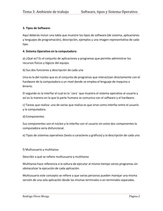 El documento habla sobre el software, los tipos de software (de sistema, aplicaciones y lenguajes de programación), y los sistemas operativos. Explica que el software controla las acciones del hardware y se divide en tres partes principales. Luego describe los sistemas operativos, sus funciones de administrar los recursos y servir como interfaz entre el usuario y la computadora, y menciona ejemplos como Windows, Mac OS, Linux y Android.
