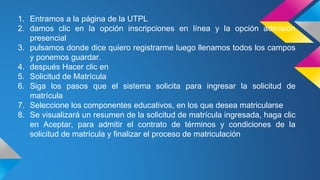 Para matricularse en la UTPL, los estudiantes deben ingresar a la página web de la universidad, hacer clic en las opciones de inscripción en línea o admisión presencial, llenar los campos requeridos, y seguir los pasos solicitados por el sistema para ingresar la solicitud de matrícula, seleccionar los cursos deseados, y aceptar los términos y condiciones.