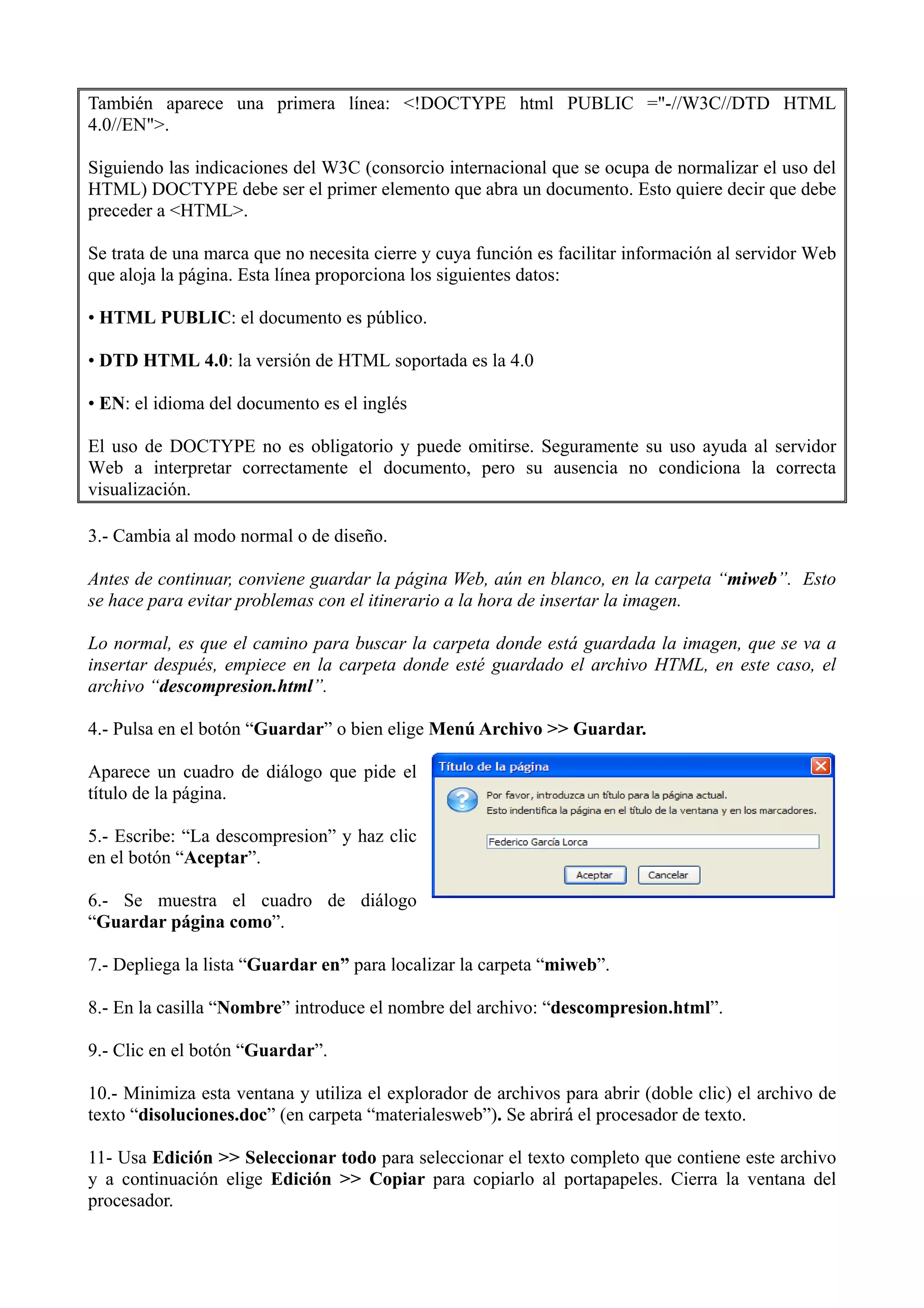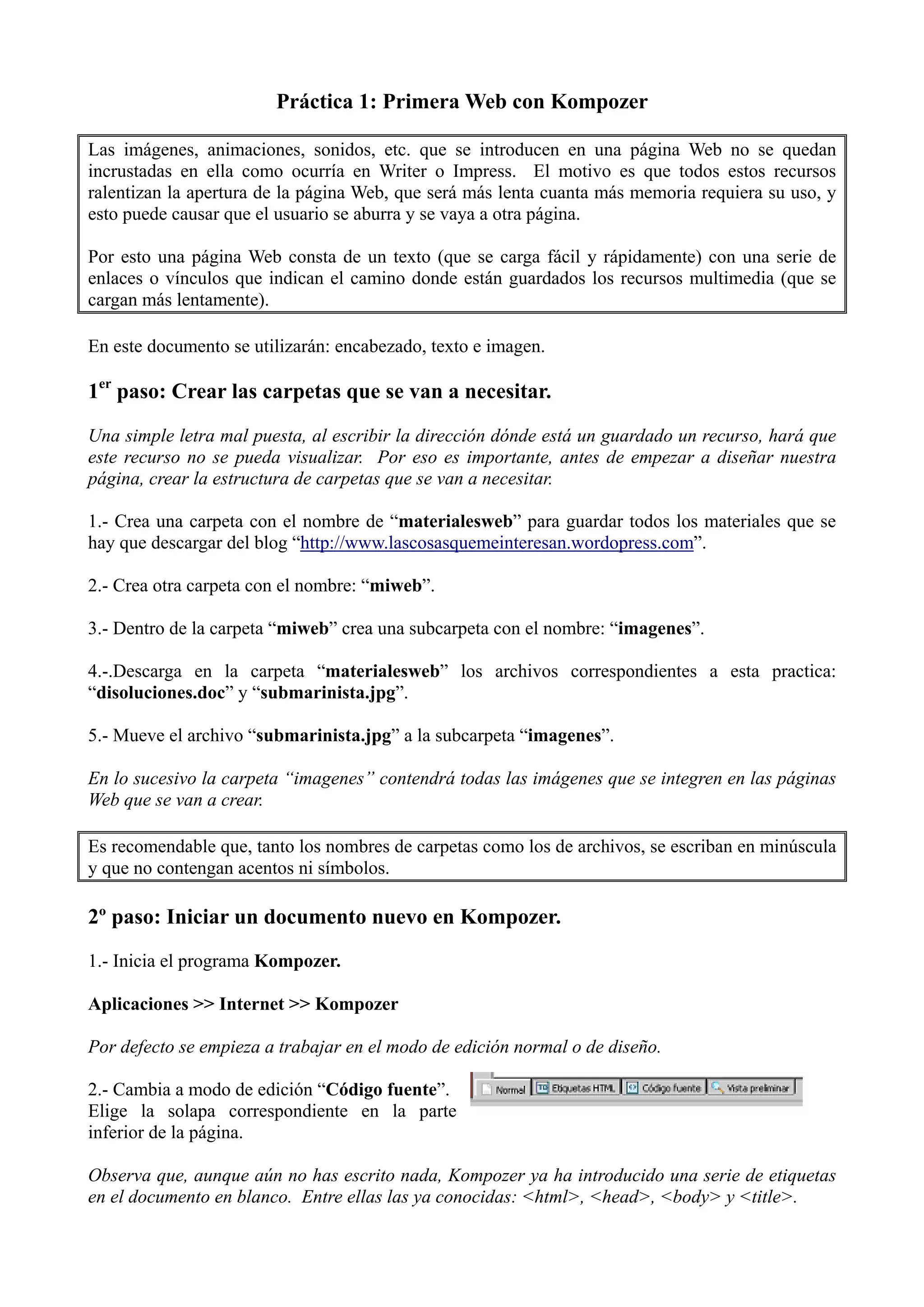 Este documento proporciona instrucciones paso a paso para crear una primera página web simple utilizando el editor Kompozer. Incluye cómo crear la estructura de carpetas, iniciar un nuevo documento HTML, pegar texto de otro archivo, agregar formato al texto como títulos y subíndices, e insertar y alinear una imagen. El objetivo es crear una página web básica con texto y una imagen para practicar el uso de Kompozer.
