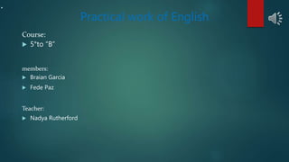 El documento presenta un resumen de un trabajo práctico de inglés para el curso de 5° grado "B" realizado por Braian Garcia y Fede Paz, bajo la supervisión de la profesora Nadya Rutherford. El trabajo aborda causas y soluciones para prevenir la contaminación, sugiriendo acciones como no arrojar basura, usar la bicicleta en lugar de vehículos motorizados, cuidar las plantas y reciclar.
