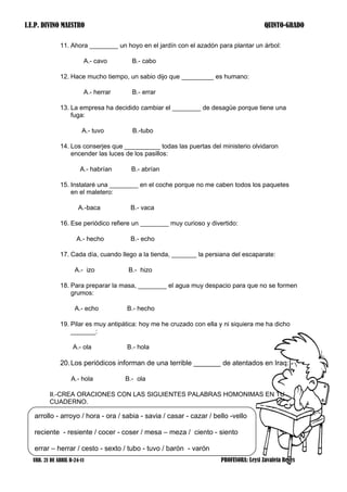 Este documento presenta un ejercicio de 20 preguntas sobre palabras homónimas para que el estudiante elija la palabra correcta que complete cada oración. Luego, pide crear 2 oraciones con 20 pares de palabras homónimas dados. El objetivo es practicar el uso adecuado de palabras que suenan igual pero tienen significados diferentes.