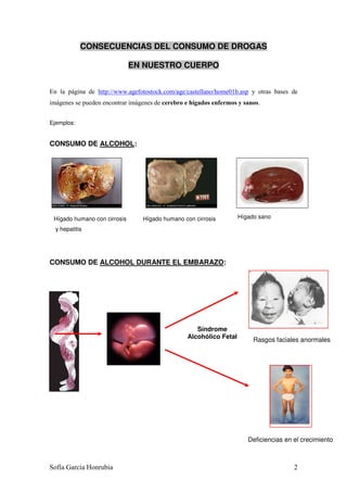 Este documento describe una actividad para estudiantes de 1o de bachillerato sobre los efectos de las drogas en el cuerpo humano. Los estudiantes observarían imágenes de órganos dañados por el consumo de alcohol, tabaco u otras drogas y completarían un cuestionario. Luego investigarían organizaciones que ayudan a dejar el consumo de drogas y usarían herramientas TIC como imágenes y videos para analizar más a fondo los daños de las drogas.