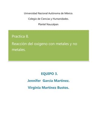 Este documento describe un experimento de oxidación de metales y no metales. Se oxidó magnesio, sodio, azufre y carbón y se analizaron los productos formados. El magnesio y sodio formaron óxidos básicos que dieron color verde con el indicador universal. El azufre y carbón formaron óxidos ácidos que dieron color rosa. Los metales reaccionan con oxígeno para formar óxidos básicos mientras que los no metales forman óxidos ácidos.