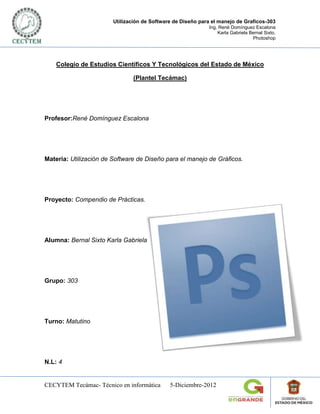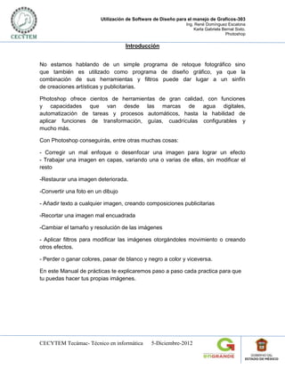 Este documento presenta un resumen de 8 prácticas realizadas en el curso de "Utilización de Software de Diseño para el manejo de Gráficos" usando Photoshop. Las prácticas incluyen blanqueamiento de dientes, fotomontaje, fusión de capas, creación de fondos de pantalla, agregar efectos a texto, hacer tarjetas navideñas, crear avatares y agregar efectos de luz neón. El documento explica paso a paso cómo realizar cada práctica y concluye que el curso ayud