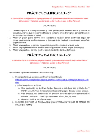 El documento presenta dos prácticas calificadas para un estudiante de 5° año de secundaria. La primera práctica incluye 5 pasos para modificar y agregar gadgets a su blog personal, incluyendo agregar seguidores por correo electrónico, una foto, compartir en redes sociales, y mostrar noticias. La segunda práctica incluye subir un archivo a varias plataformas como SkyDrive, Scribd, Calameo y Slideshare, y crear entradas en su blog sobre cada plataforma.
