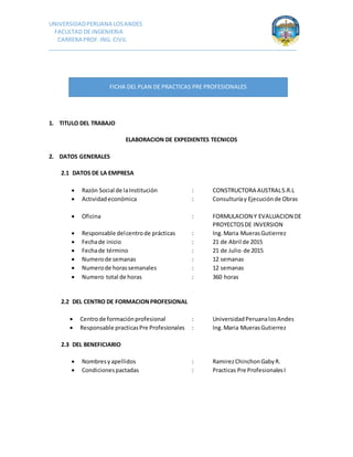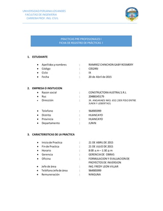 El documento presenta dos fichas de prácticas pre-profesionales para estudiantes de ingeniería civil en la Universidad Peruana Los Andes. La primera ficha detalla la práctica de Gaby Ramirez Chinchon en Constructora Australs para elaborar expedientes técnicos. La segunda ficha describe la práctica de Carlos Choque Mamani en Consorcio Vial Viques para realizar perfiles topográficos y liquidación de obras.