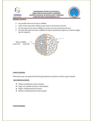 UNIVERSIDAD TÉCNICA DEMACHALA DIRECCIÓN DE NIVELACIÓN Y ADMISIÓN SISTEMA NACIONAL DE NIVELACIÓN Y ADMISION CURSO DE NIVELACIÓN PERIODO 2013 OBSERVACIONES: Fue posible observar las micro celdillas Cabe recalcar que estas células ya que estas se encuentran muertas En 10x vimos en las micro celdillas y escomo si la una está encima de otra En el de 40x vimos las micro celdillas de mayor tamaño pero igual no se observa algún tipo de orgánulo Micro celdillas Lente 10x lente 40x Micro celdillas CONCLUSIONES: Determinar que con ayuda del microscopio podemos visualizar su forma a gran tamaño. RECOMENDACIONES:     Utilizar mandil para evitar manchas Coger con cuidado el porta y cubreobjetos Seguir cuidadosamente los pasos Utilizar cuidadosamente el microscopio CUESTIONARIO: