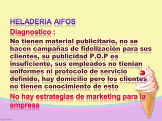 El documento propone varias estrategias de marketing para aumentar las ventas de una heladería durante los próximos cuatro meses, incluyendo adecuar el menú para más clientes, usar material publicitario en el punto de venta, y entregar tarjetas a los clientes. También recomienda mejorar el servicio al cliente a través de protocolos como saludar cordialmente y dar información completa del menú.
