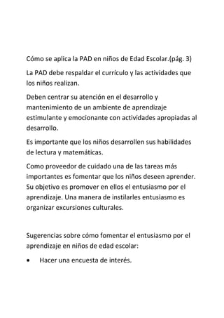 Este documento proporciona información sobre prácticas apropiadas para niños en edad escolar. Enfatiza la importancia de crear un ambiente estimulante que fomente el aprendizaje y el desarrollo de habilidades, así como promover el entusiasmo por el aprendizaje a través de actividades interesantes. También discute teorías del desarrollo, diferentes ámbitos del desarrollo de los niños, y sugerencias para apoyar a niños con necesidades especiales como el síndrome de Down y el autismo.
