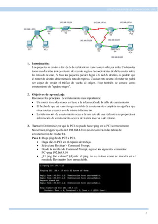 El documento describe una serie de prácticas académicas sobre la estructura de redes de comunicación utilizando Cisco Packet Tracer. Se enfocan en el enrutamiento, la configuración de tablas de enrutamiento y la resolución de problemas de conectividad entre diferentes dispositivos en una red. Los objetivos incluyen aprender sobre los principios del enrutamiento, la creación de rutas estáticas y la realización de simulaciones de tráfico de red.
