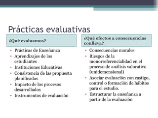 El documento habla sobre la evaluación en la educación. Explica que la evaluación debe ser un proceso complejo, multirreferenciado y reflexivo para mejorar la enseñanza y los aprendizajes de los estudiantes. También debe evitarse asociar la evaluación solo con castigo o control. La evaluación debe analizar el impacto en los aprendizajes de los estudiantes, la adecuación de las explicaciones y actividades propuestas, y la relación entre la planificación y lo realizado.