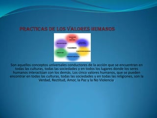Los cinco valores humanos fundamentales que se encuentran en todas las culturas y sociedades son la verdad, la rectitud, el amor, la paz y la no violencia. Estos valores incluyen la honestidad, la responsabilidad, la humildad y la justicia. Otros valores importantes mencionados son la puntualidad, la tolerancia, la amistad, la solidaridad y la paz.