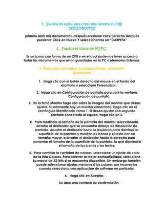 El documento explica las funciones de diferentes elementos del sistema operativo Windows y de herramientas como Paint y WordPad. Detalla los pasos para acceder a accesorios, crear carpetas, configurar la pantalla y aplicar formatos a texto. Incluye ejemplos de tablas y números matemáticos formateados.