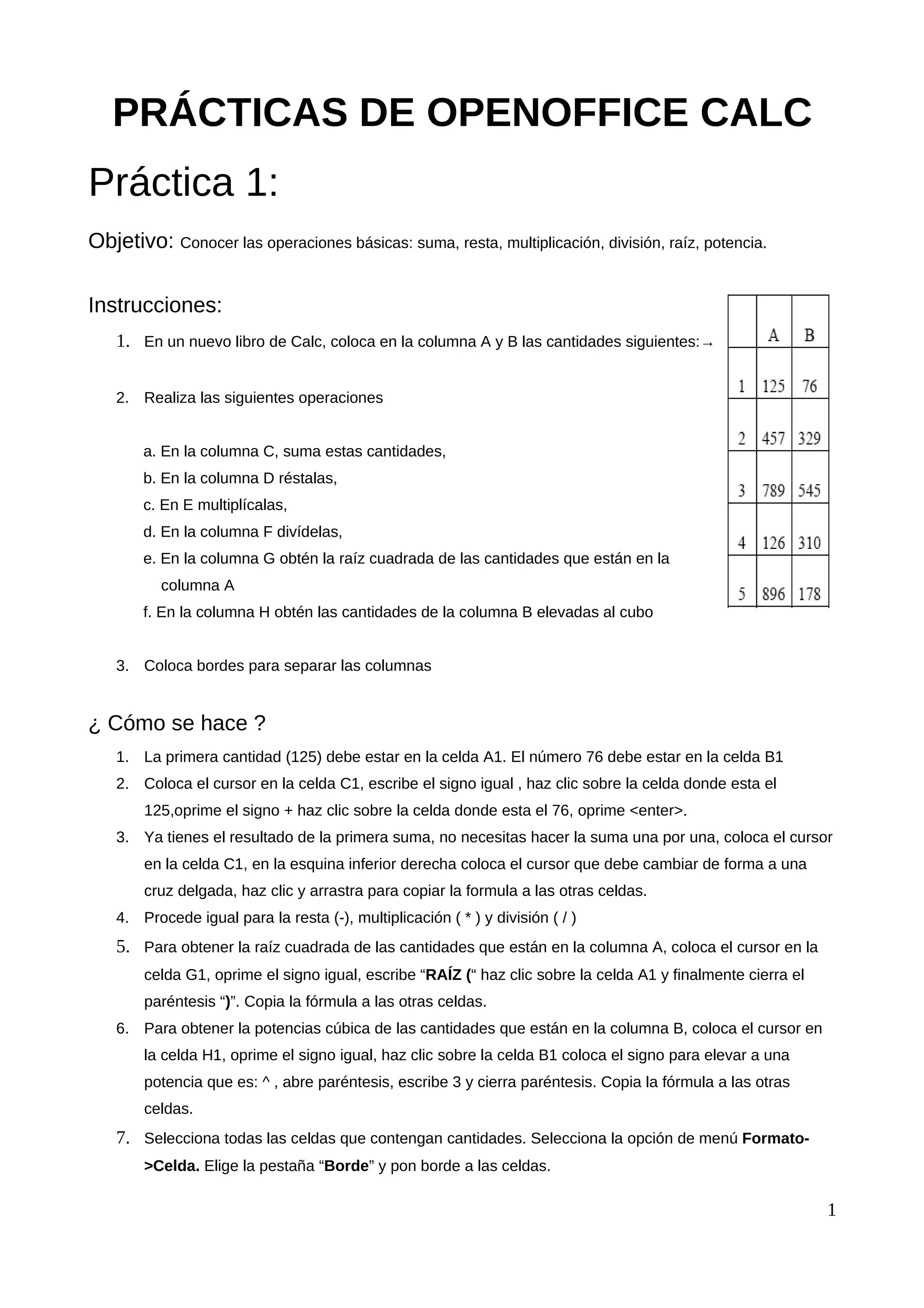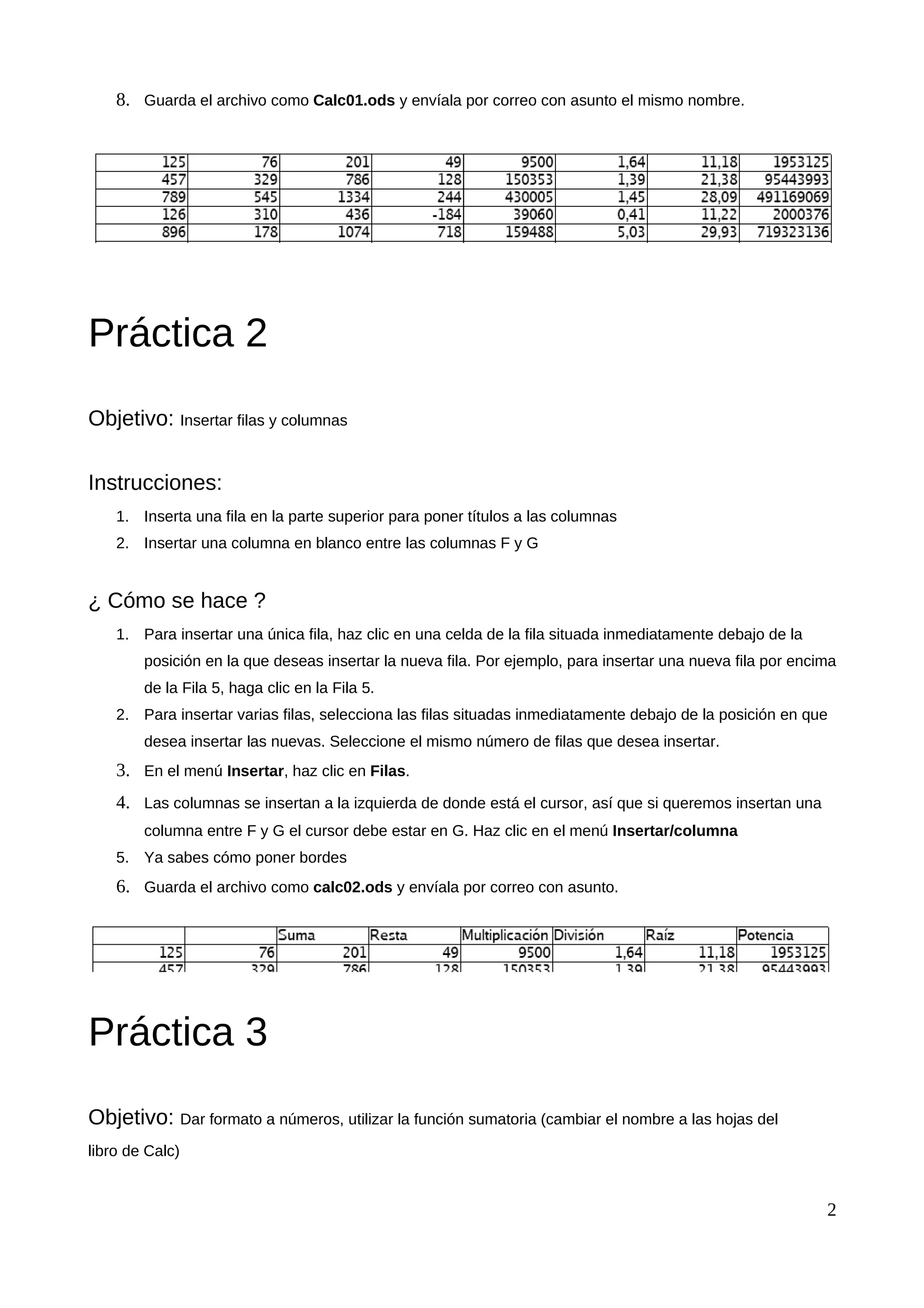 Este documento presenta cinco prácticas de OpenOffice Calc para aprender funciones básicas como sumas, restas, multiplicaciones, divisiones, raíces y potencias. Las prácticas incluyen realizar cálculos matemáticos, dar formato a números, insertar filas y columnas, cambiar el nombre de hojas, y configurar la página.