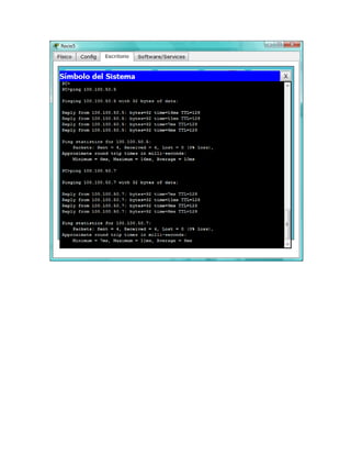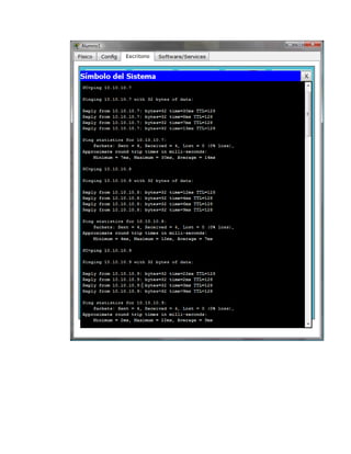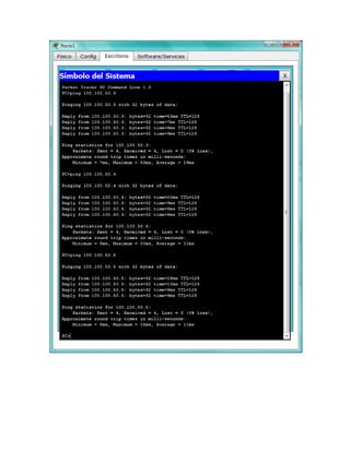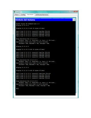 El documento describe tres prácticas de simulación de redes usando Packet Tracer. La práctica 5 simula 4 PCs conectados a un concentrador. La práctica 6 simula 6 PCs conectados a un switch vacío. La práctica 7 simula 20 PCs divididos en dos redes de 10 PCs cada una, conectados a través de dos switches. Cada práctica incluye la configuración de direcciones IP, máscaras de red y puertas de enlace de los PCs, y la verificación de la conectividad mediante ping