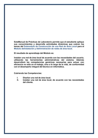 Este manual de prácticas de laboratorio permite a los estudiantes aplicar sus conocimientos sobre la construcción de redes de área local a través de actividades dinámicas. Cubre temas como diseñar e instalar una red LAN según las necesidades del cliente. El resultado es que los estudiantes puedan instalar y administrar redes LAN utilizando herramientas administrativas. El manual incluye 10 prácticas guiadas sobre temas como interconectar computadoras usando switches, aplicar direcciones IP, y verificar conectividad mediante ping.