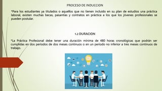El documento describe las características y requisitos de las prácticas profesionales que realizan los estudiantes. Explica que las prácticas permiten aplicar conocimientos en un trabajo real y aprender sobre un área profesional, y que ofrecen a las empresas una oportunidad de reclutar futuros empleados. También cubre los roles de tutores académicos y profesionales, los lugares donde se realizan prácticas, y los beneficios que aportan a los perfiles profesionales de los estudiantes.